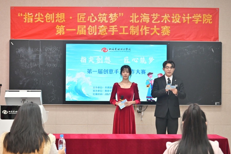 为进一步提高学生实践创新能力,推动传统手工艺技艺与现代设计思维深度融合,搭建青年学子艺术才华展示与竞技平台,11月21日,由共青团北海艺术设计学院委员会主办,教育学院承办的“指尖创想 匠心筑梦”北海艺术设计学院第一届创意手工制作大赛决赛在西校区图书馆506智慧教室顺利举行。教育学院院长熊秀峰、副院长周劲志,书法学院副院长李家琪及各二级学院分团委书记出席决赛现场。美术学院创新创业工作负责人韩洋、教育学院教师张雨悦、马克思主义学院教师张鸿悦应邀担任决赛评委。