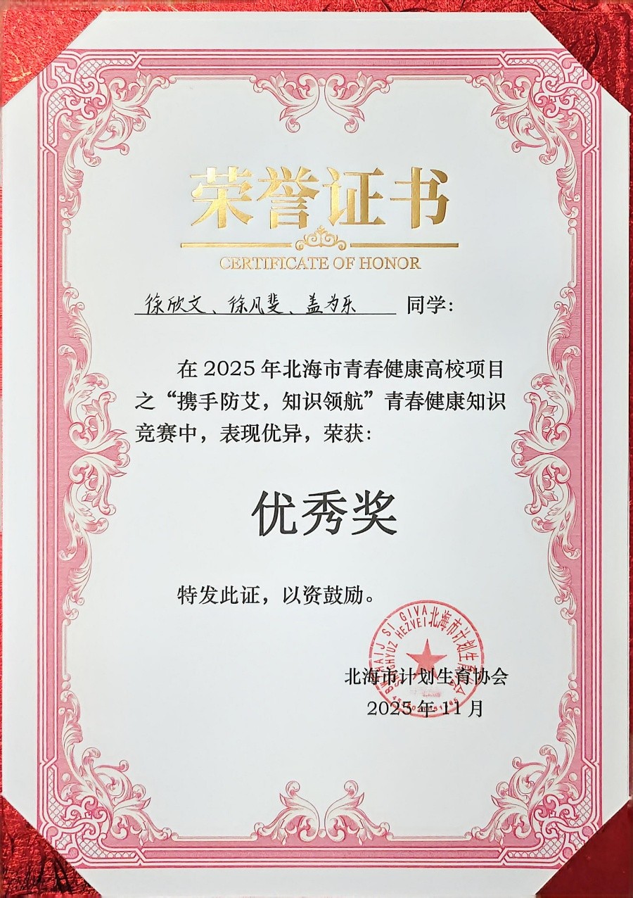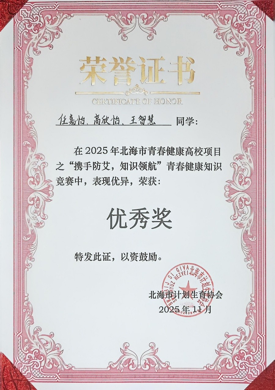近日,由北海市计划生育协会主办、桂林电子科技大学协办的2025年北海市青春健康高校项目之“携手防艾,知识领航”青春健康知识竞赛圆满落幕。我校六名学生凭借扎实的知识储备和出色的现场表现,在众多参赛队伍中脱颖而出,荣获优秀奖。