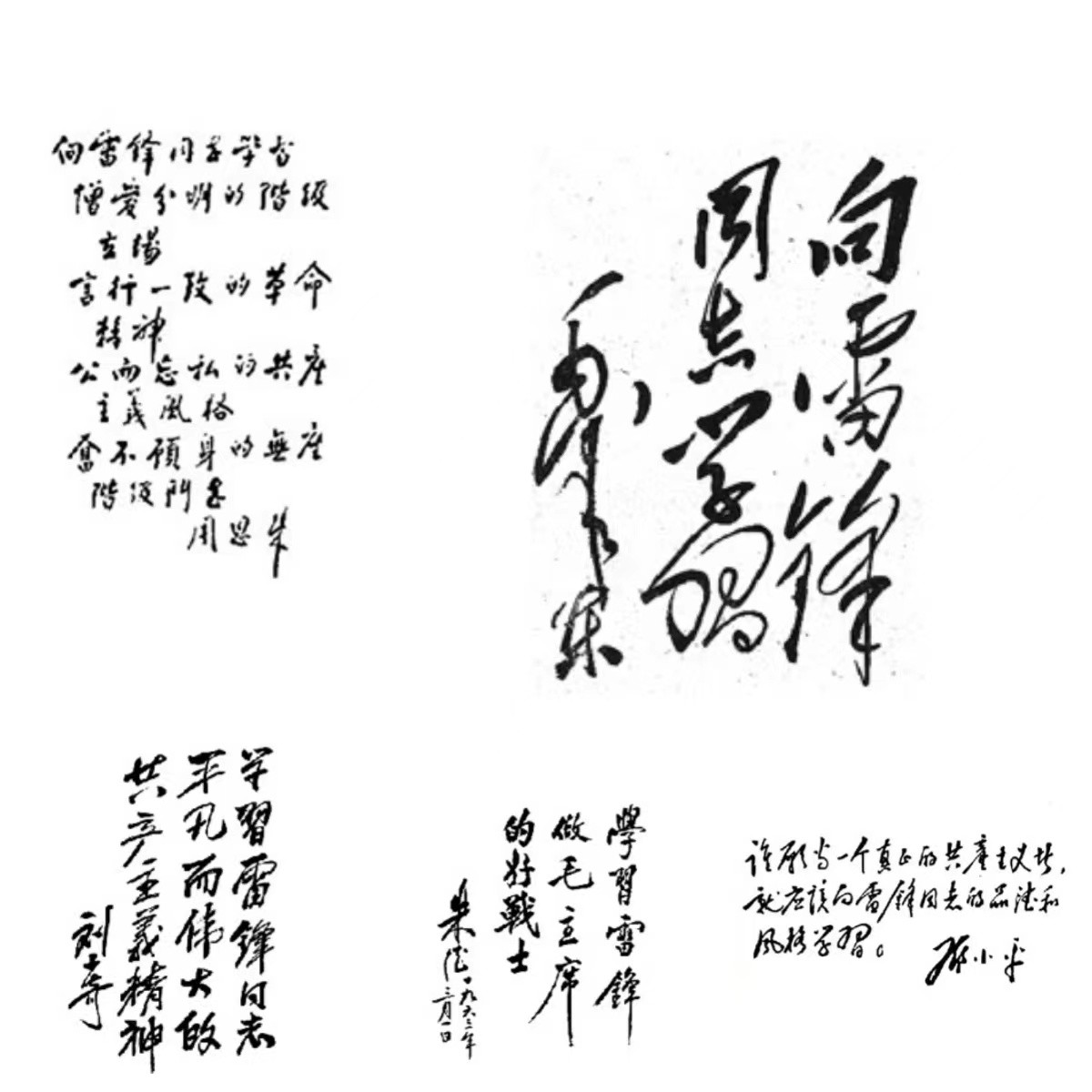 196335日,毛泽东“向雷锋同志学习”题词发表。随后,刘少奇、周恩来、朱德、邓小平等老一辈革命家也相继题词,发出学习雷锋的伟大号召。